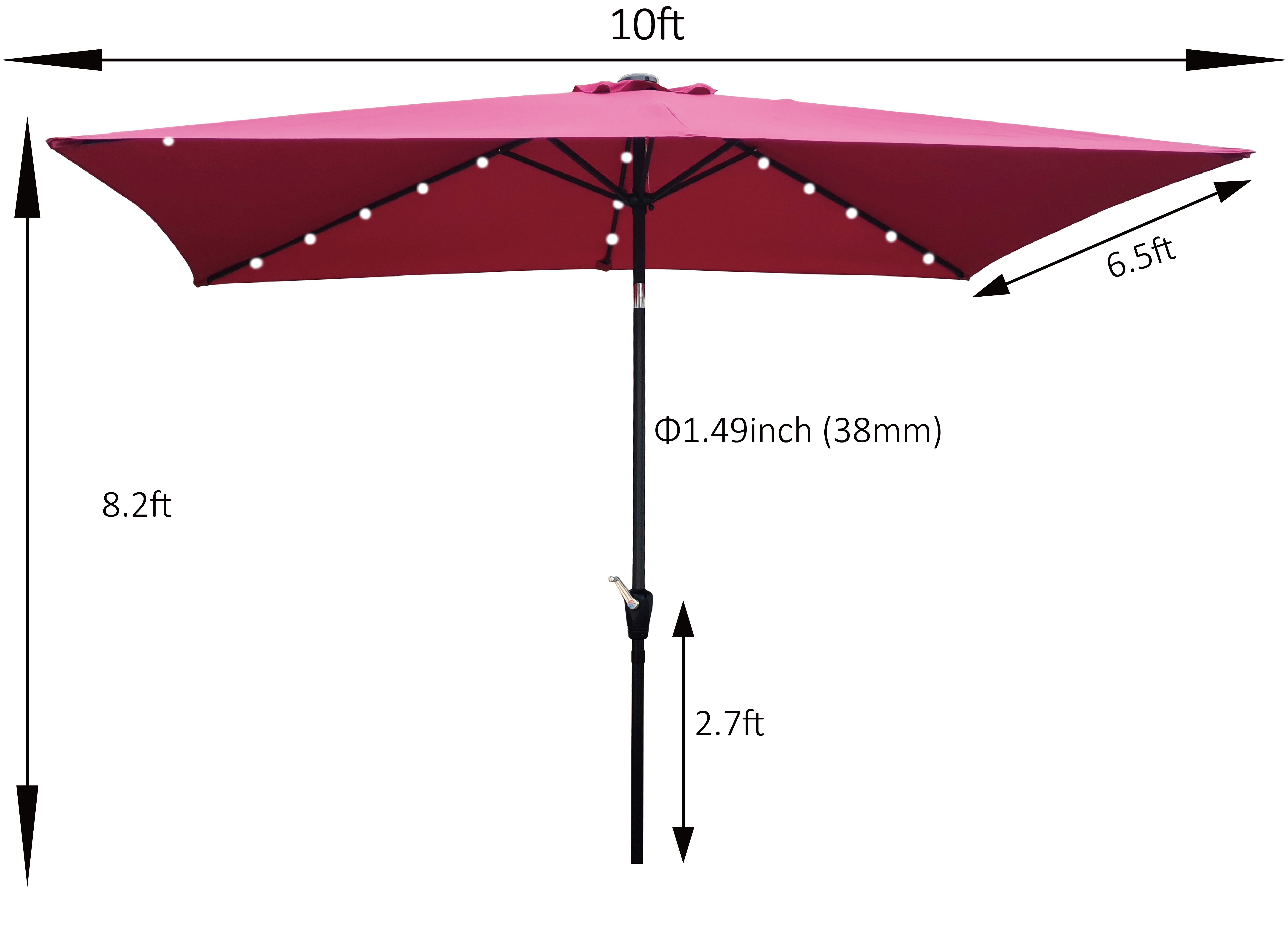 Energy-Efficient Lighting: This 10x6.5 ft rectangle LED patio umbrella is designed with solar powered LED lights; adding shade at day and offering light at night to provide a romantic starry night effect for your patio. The umbrella has 26 solar-powered LED lights and an easy on/off switch; Square solar panel at top means the LED lights last 6-8 hoursmaking your evening illumination magical.