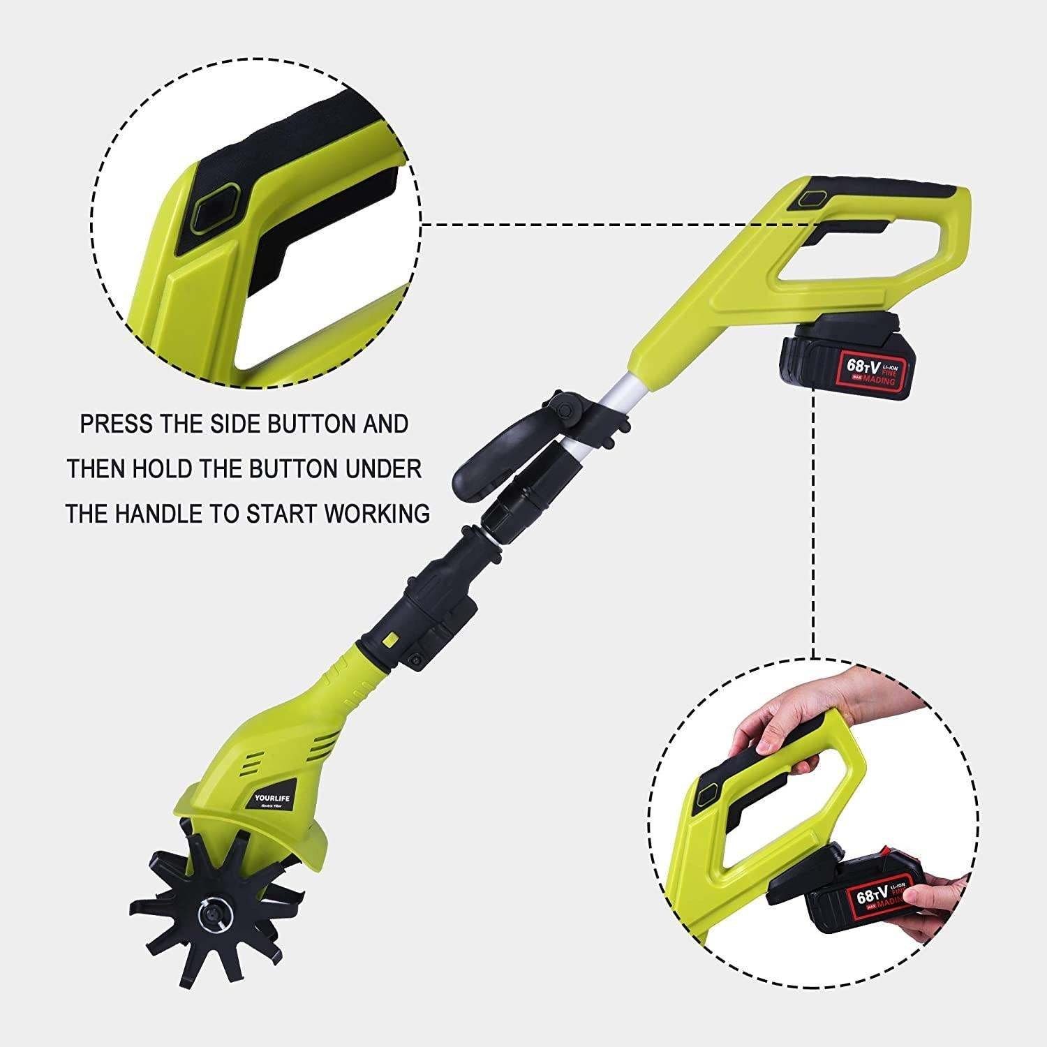 Portable: Cordless and detachable design, lithium battery and charge included, comfortable grip, lightweight and portable.Efficient: Cultivated width: 4.0"; Depth: 6", 250 rpm torque, easily crush the soil and make the working more efficient.