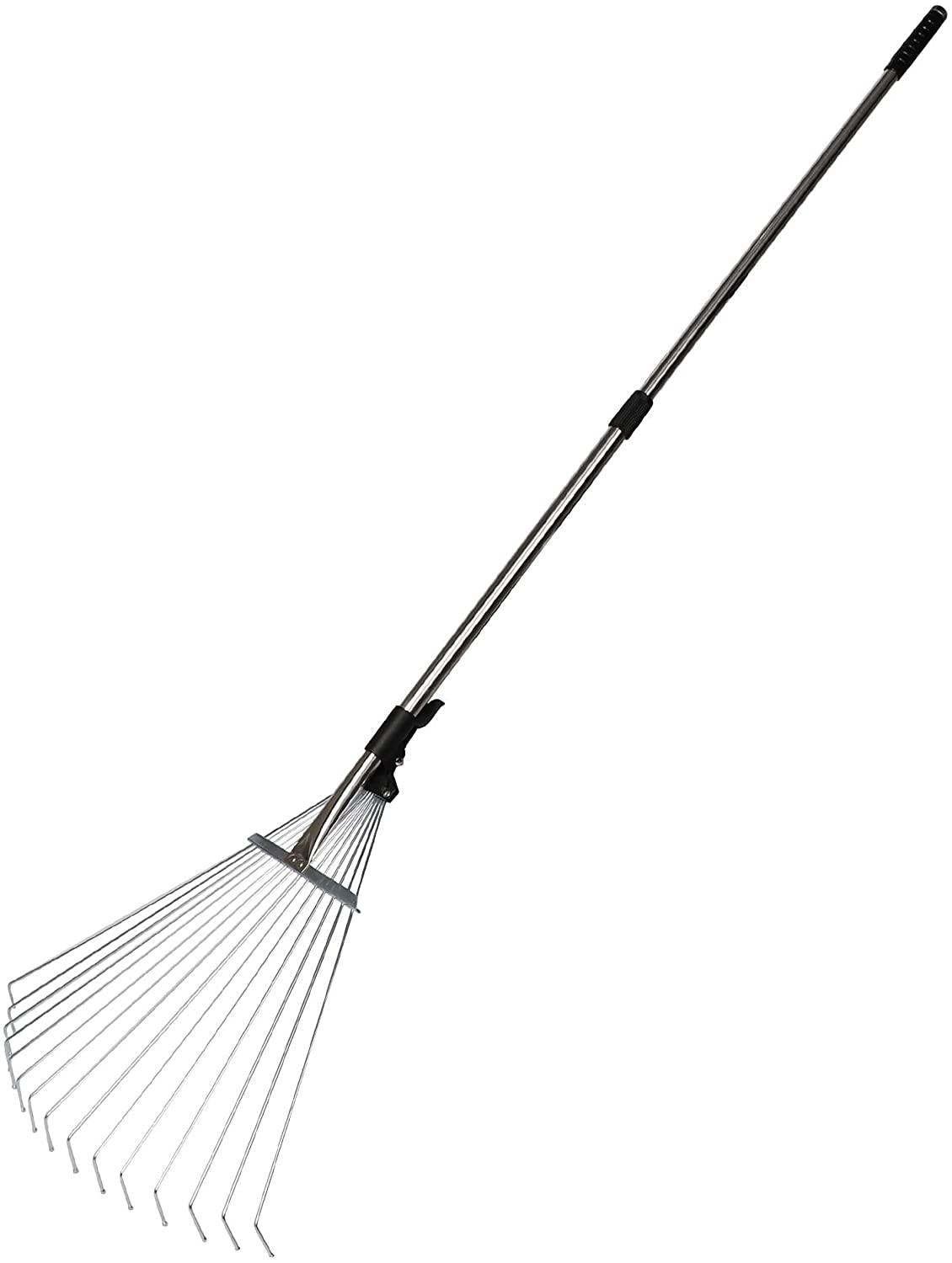 62.6 Inches Long - Long handle garden leaf rake which could less bend down and less fatigue during long time work. Please noted that this tool is not meant for cement or heavy-duty debris.Adjustable - Designed with expandable 7.5'-20' width fan folding head which can be locked any position in between. Wide head great for you to quickly clean leaves, small debris off lawns. 7.5' width suitable for tight areas like under hedges or between flower beds.Sturdy & Durable - Our products are made of high-quality stainless steel which is anti-rust and not easy to bend or break. The 0.76-inch diameter stainless steel handle makes the steel tines more stable.Non-slip & Comfortable - The black handle at the bottom of the rake is made of high-strength and good-tenacity plastic and has a comfortable non-slip design.Humanized Design - The well-designed smooth spherical rake tip will not damage grassroots or plants during use. The adjust-ability of the rake head makes for easy storage which can easily be stored on a shelf or in a corner.