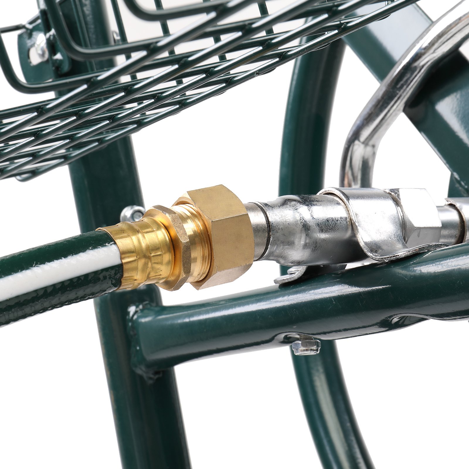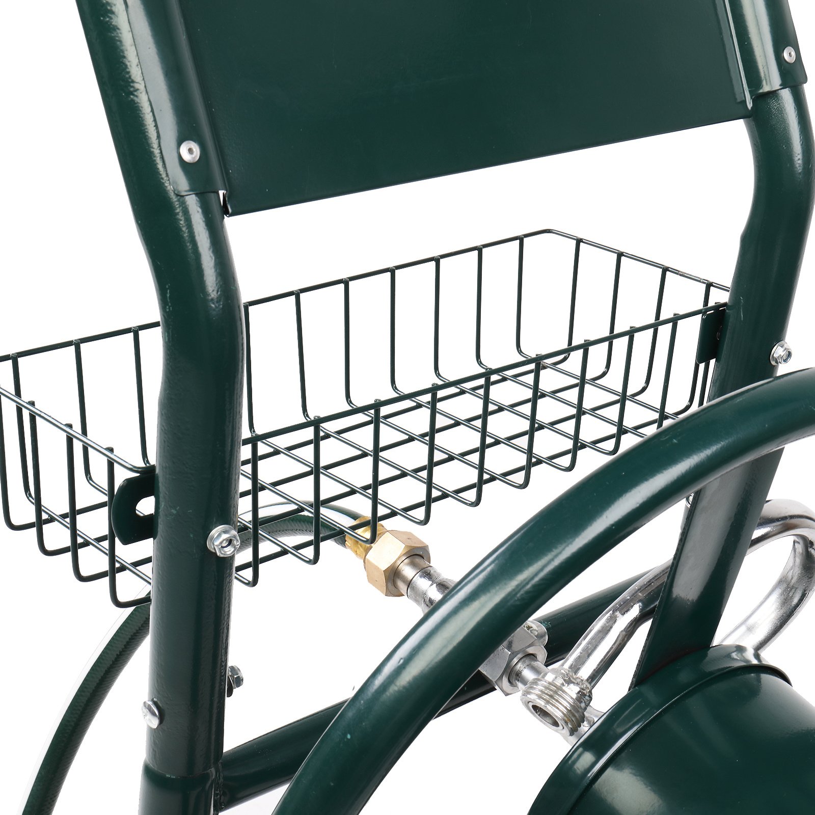 This heavy duty hose reels can hold 229 feet of 5/8 inch or 393 feet of 1/2 inch water pipe. This product is constructed with a tubular steel frame with a green powder-coated surface, which is durable and suitable for outdoor use.