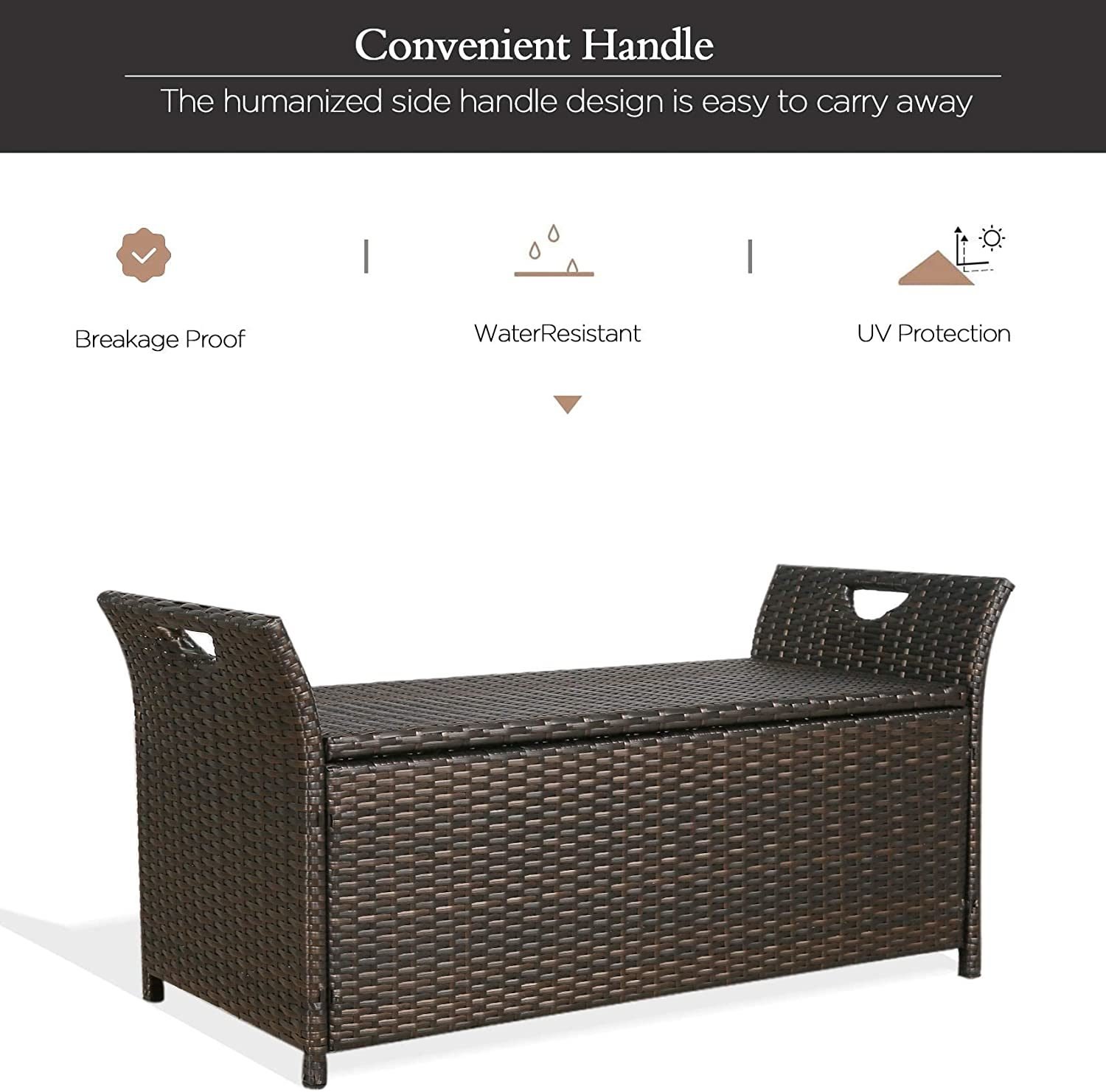 Our all-weather wicker storage bench is durable and functional. It designed with side handle to make you easy to move and carry this deck box. The thick bench cushion also make you more comfortable to sit on it and designed with zipper to detach and clean it easily. Appropriate storage capacity enough to store pool toys, gardening supplies,lawn chair cushions and more. The power-coated steel frame is rust-resistant for long-lasting use. It is wrapped with hand-woven PE wicker, which is weather-resistant and high-quality to add extra fashion. Advanced pneumatic support system to make lids soft open and close gently. It will give you extra seating experience with a flat top surface. You can enjoy the outdoor storage bench in unison with the great outdoors for many years to come.