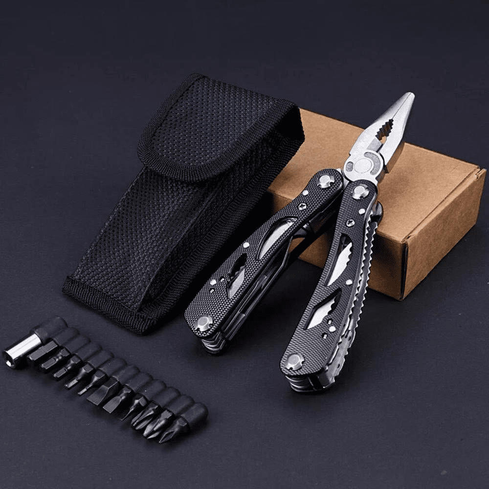 Designed with everything that you need in one tool like Pliers; Knife; Wire Cutters; Medium Slotted Screwdriver; Mini Slotted Screwdriver; Phillips Screwdriver; Metal File; Leather Punch; Fish Hook Remover; Wood Saw; Wire Stripper; Can Opener; Bottle Opener; Large Slotted Screwdriver; Safe Locking Mechanism.