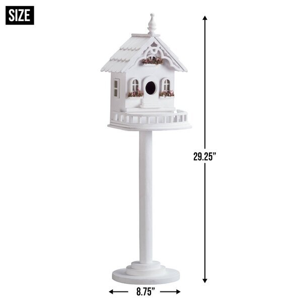 Freestanding birdhouse can be placed anywhere. The little touches make this so unique and charming, like the tiny flower boxes, scalloped roof shingles and quaint gingerbread. Clean-out hole in back. Weight 3.2 pounds. 9.4 x 8.4 x 29.2 inches tall. Base is 8.75 inches in diameter. Fir wood and plywood.