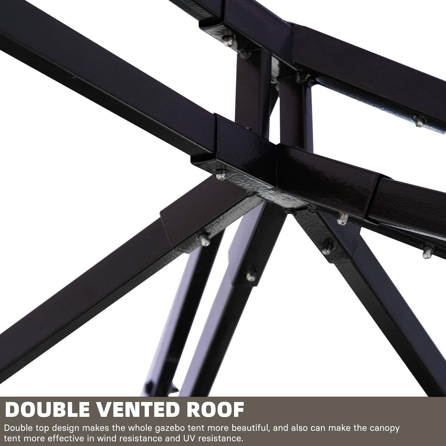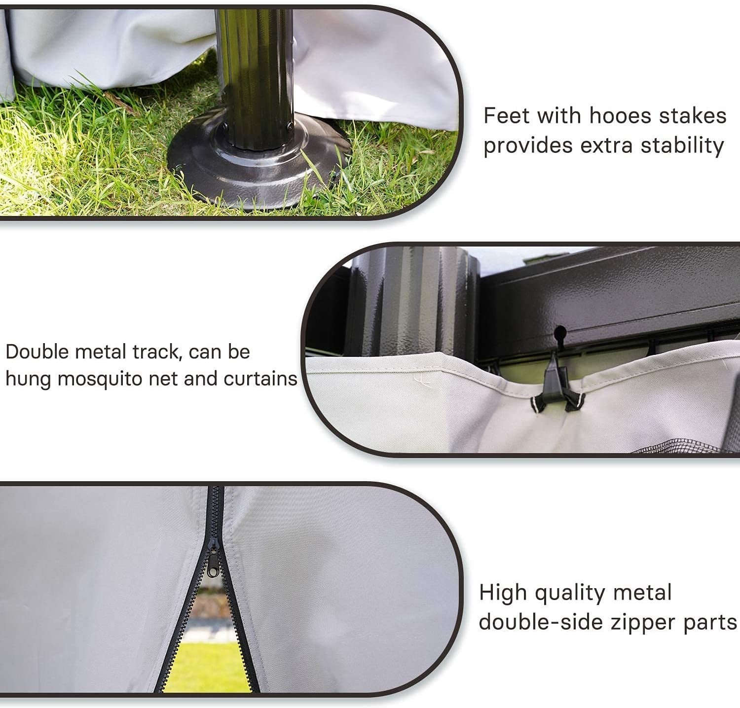PROPER PROTECTION: The weather-resistant canopy fabric provides protection against the sun's harmful UV rays to keep you in a comfortable shaded area on hot sunny days. 8 leak holes on the canopy top offer added protection on rainy days. ZIPPERED CURTAINS: The water and wind resistant zippered curtains on all sides makes the gazebo a perfect private space. The curtains come with strings and nylon closures, which allows you to take them down to create an entirely airy environment. GOOD QUALITY METAL: Our gazebo interior frame is made of iron with anti-rust coating, which is strong and hard.The long side beam uses= two-section type to fix, so the wind resistance ability will be a little weaker.We provide nails free for you. Please make sure to fix the product on the grass or deck during installation. VERSATILE USAGE: The gazebo is ideal for providing shade and protection during recreational and commercial events, such as outdoor parties, family gatherings, BBQ, market stalls and more. NOTICE:The main function of this gazebo is to shade the sun, please do not use it in heavy rain, strong wind, heavy snow or other similar weather, in case of the above weather, please remove the top in time.Good use habits will effectively extend the service life of the product.