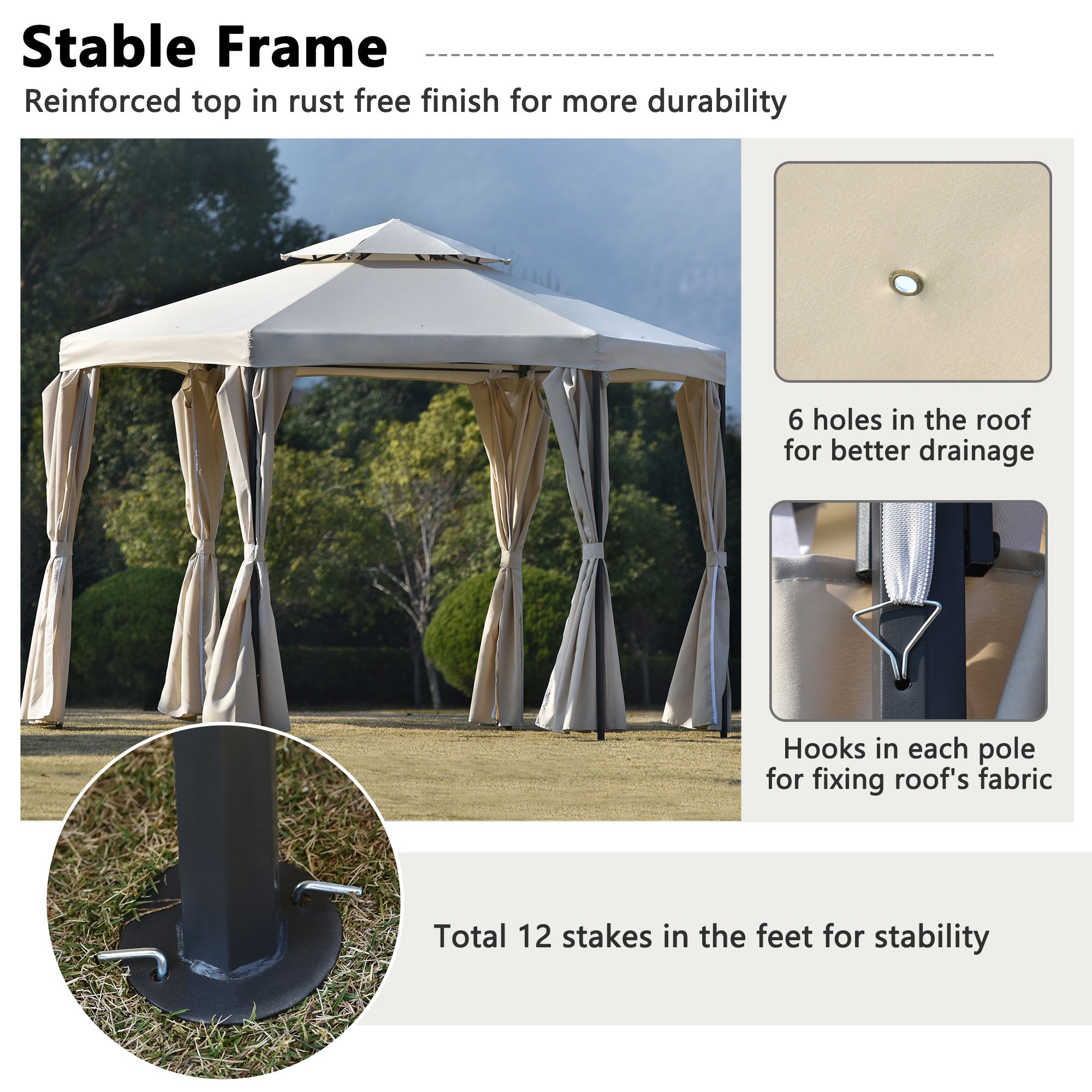 TOPMAX 11ft.Wx11ft. L Outdoor Patio Hexagon Gazebo with Polyester Curtain Side Wall; Double Roofs for Decks; Poolsides; Gardens; Beige